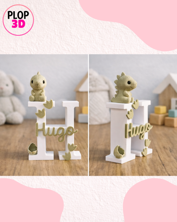 Letra de 8cm con adorable DINO, más deco acorde a la temática, huevito mas huellitas. Color a elección.